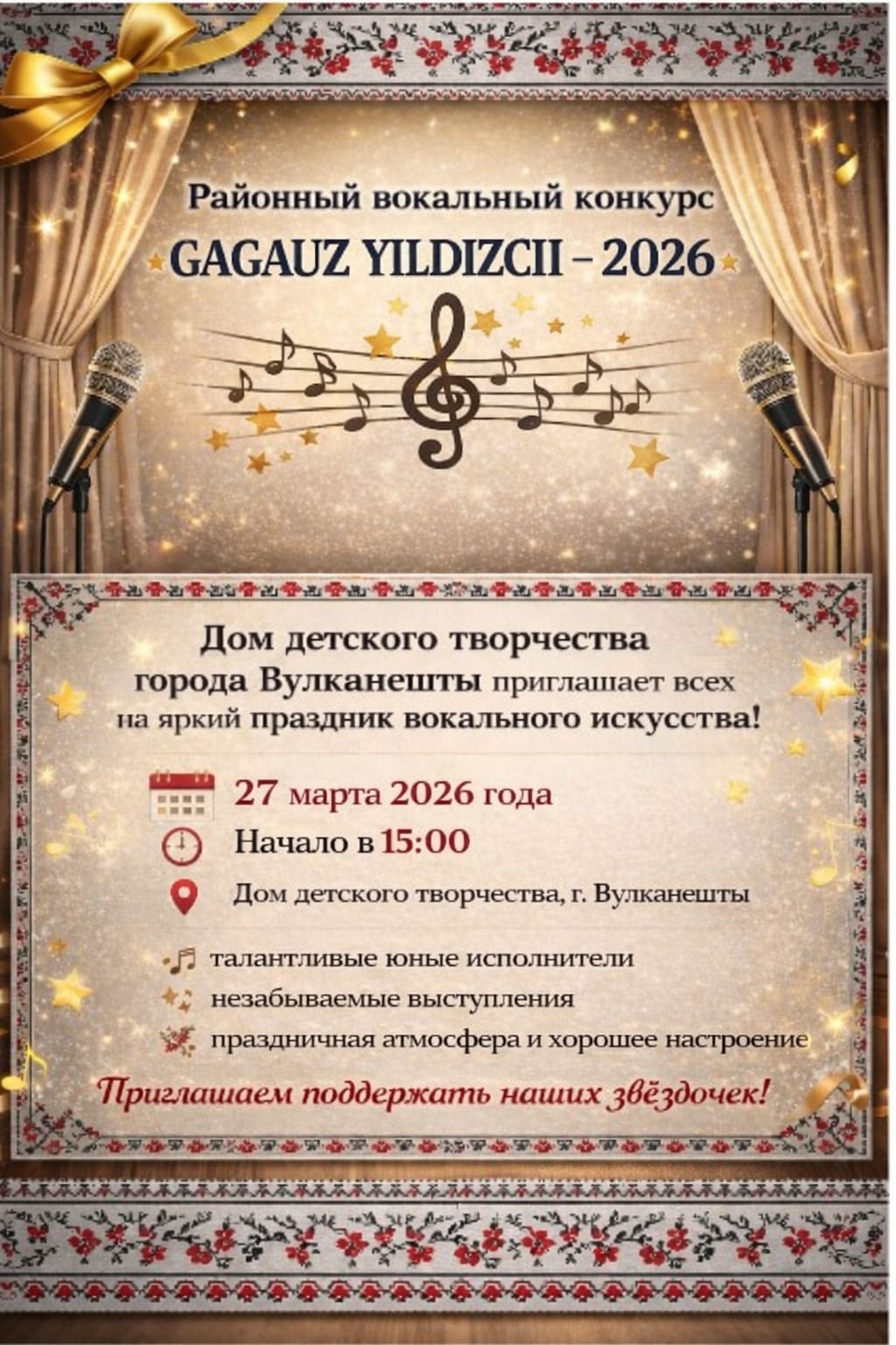 Отдел культуры Администрации Вулканештского района приглашает всех любителей музыки и творчества на яркий районный вокальный конкурс „Гагауз илдызчий -2026”, который состоится в Доме детского творчества г. Вулканешты.