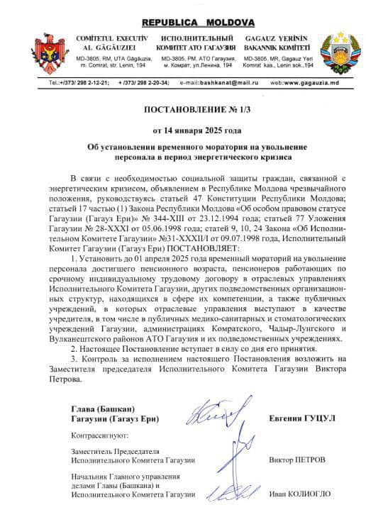 Мы не можем бросить в тяжелой ситуации тех, кто много лет честно и добросовестно работал, и отдал свои силы во благо Гагаузии. Поэтому наша команда приняла решение ввести временный мораторий до 1 апреля текущего года на увольнение пенсионеров, работающих по срочным индивидуальным трудовым договорам в структурах Исполкома и подведомственных учреждениях.