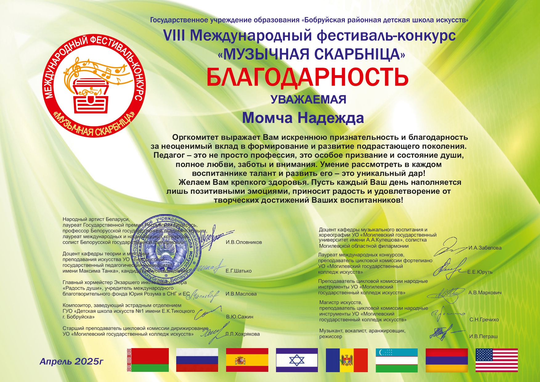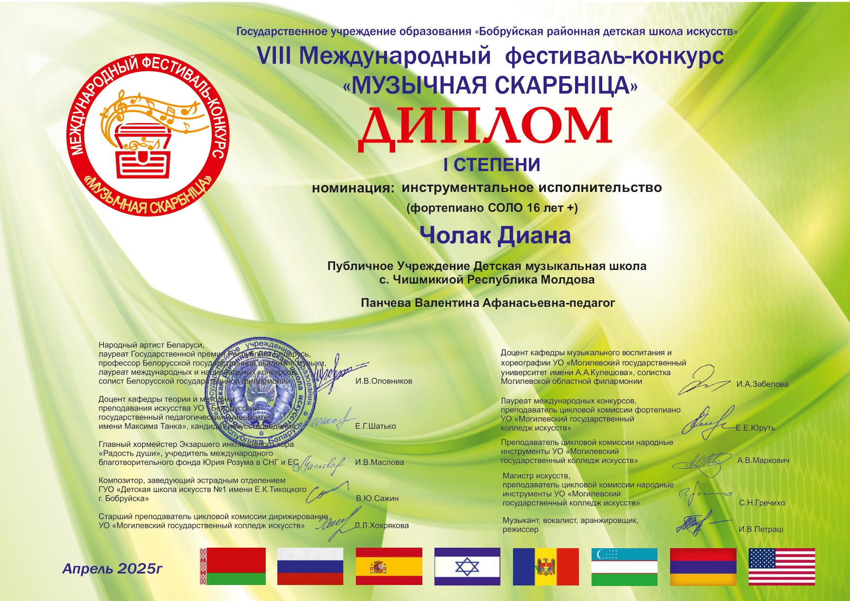 Воспитанники Детской Музыкальной школы села Чишмикиой достойно представили Молдову на VIII Международном фестивале-конкурсе “Музычная скарбница”, который в 2025 году объединил 1055 талантливых участников из 8 стран: Беларуси, Армении, Израиля, Испании, Республики Молдова, России, США и Узбекистана.
