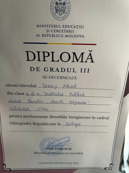 Ученики 12 класса лицея им. А. Должненко г. Вулканешты показали отличные результаты на республиканской олимпиаде по биологии: