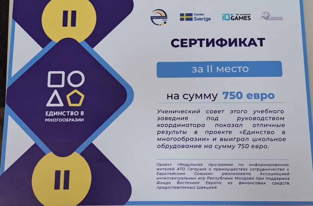Проект «Единство в многообразии» внедрен Ассоциацией интеллектуальных игр Республики Молдова при финансовой поддержке Фонда Восточная Европа за счет средств, предоставляемых Швецией.