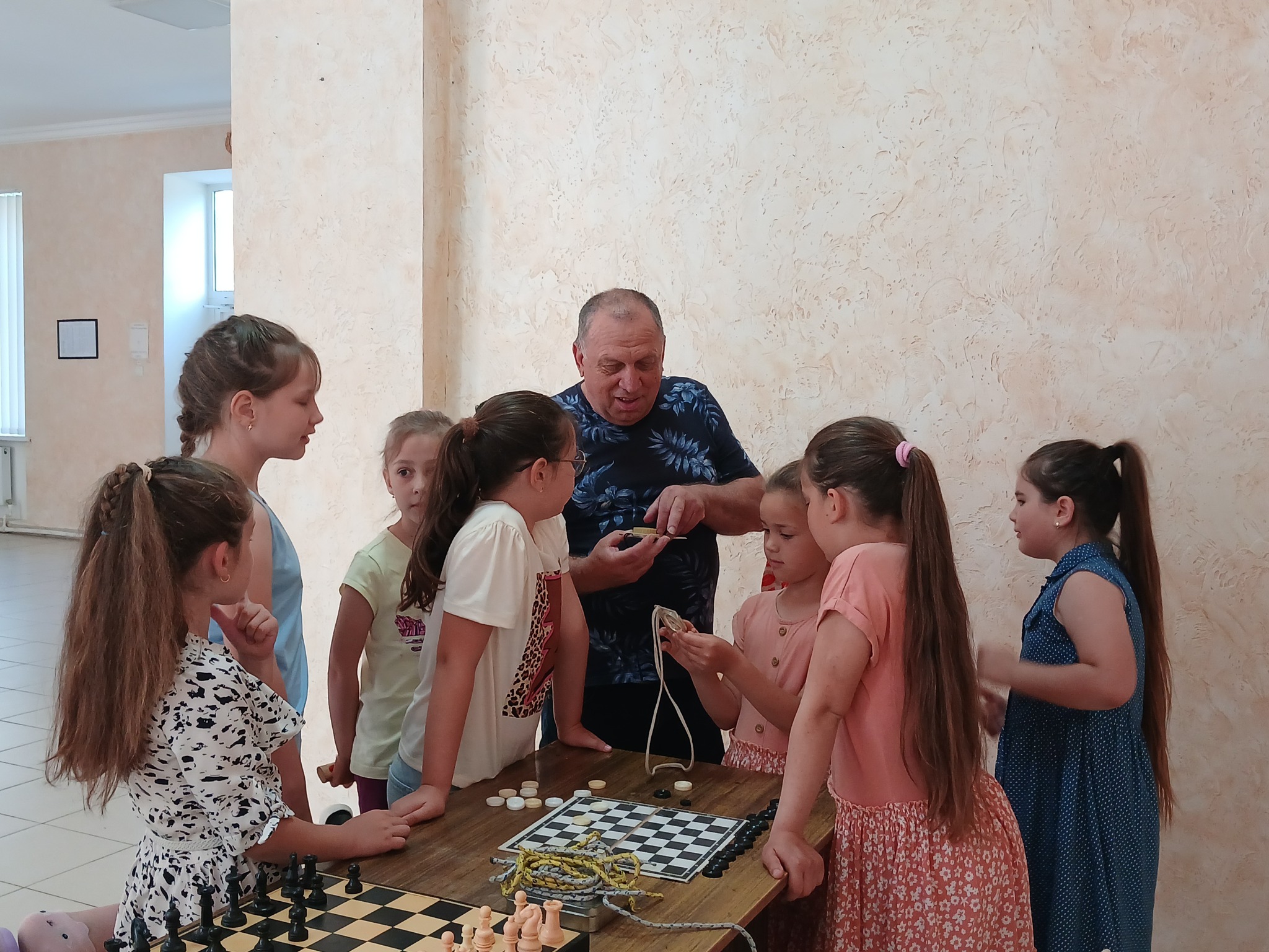 В Доме детского творчества с 2 июня по 6 июня была реализована спортивно-оздоровительная программа, которая включала разнообразные активности, направленные на укрепление здоровья и физической подготовки детей. В программу, как правило, входят спортивные мероприятия, например, настольный теннис, подвижные игры, соревнования на открытом воздухе, лазание по канатной лестнице, бросание дротиков, а также развивающие игры, такие как шашки и шахматы. Руководители кружков включили в программу «Познавательную минутку», где Кирези И. И. объяснил и показал детям как ориентироваться по компасу, что такое морской узел, где его можно использовать и многое другое.