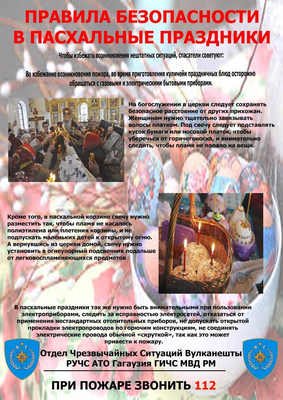 В целях минимизации возникновения пожаров, в период пасхальных праздников, необходимо соблюдать правила пожарной безопасности, для предотвращения случаев гибели людей, а также сохранности материальных ценностей на объектах культа.