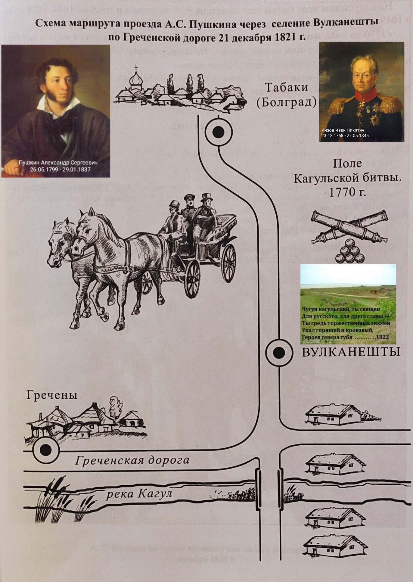 Памятник в виде фигур Пушкина А.С. и Липранди И. П., сидящих в запряжённой двумя лошадьми повозке, будет установлен у здания музыкальной школы. Установка памятника имеет культурно- гуманитарную и историческую направленность, повысит туристическую привлекательность нашего горда. Мы верим, что этот памятник станет поводом для гордости и веры всех жителей Молдовы, Гагаузии и Вулканештского района, уважающих историю своей страны и сохранивших свое самосознание на этих землях.