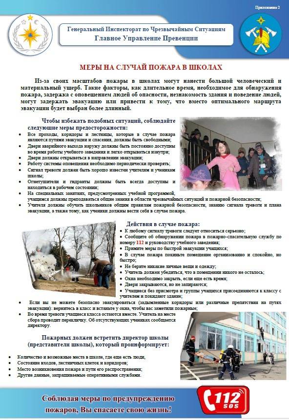 Противопожарная безопасность в школе для учащихся старших классов сводится к следующим правилам: следить за детьми, чтобы они не играли с огнем, не нагревать предметы из неизвестного материала, не оставлять включенные электроприборы без присмотра, а уходя из дома выключать их из сети, не использовать горючие средства для разжигания костров, печей, тушить костры до конца, не поджигать сухую траву или тополиный пух, не кидать в урны горящие спички, не протирать включенные электроприборы влажной тряпкой, не вешать корзины с цветами над электроприборами или проводами, не тушить загоревшиеся электроприборы водой, звонить в пожарную службу при обнаружении даже самого мелкого пожара.