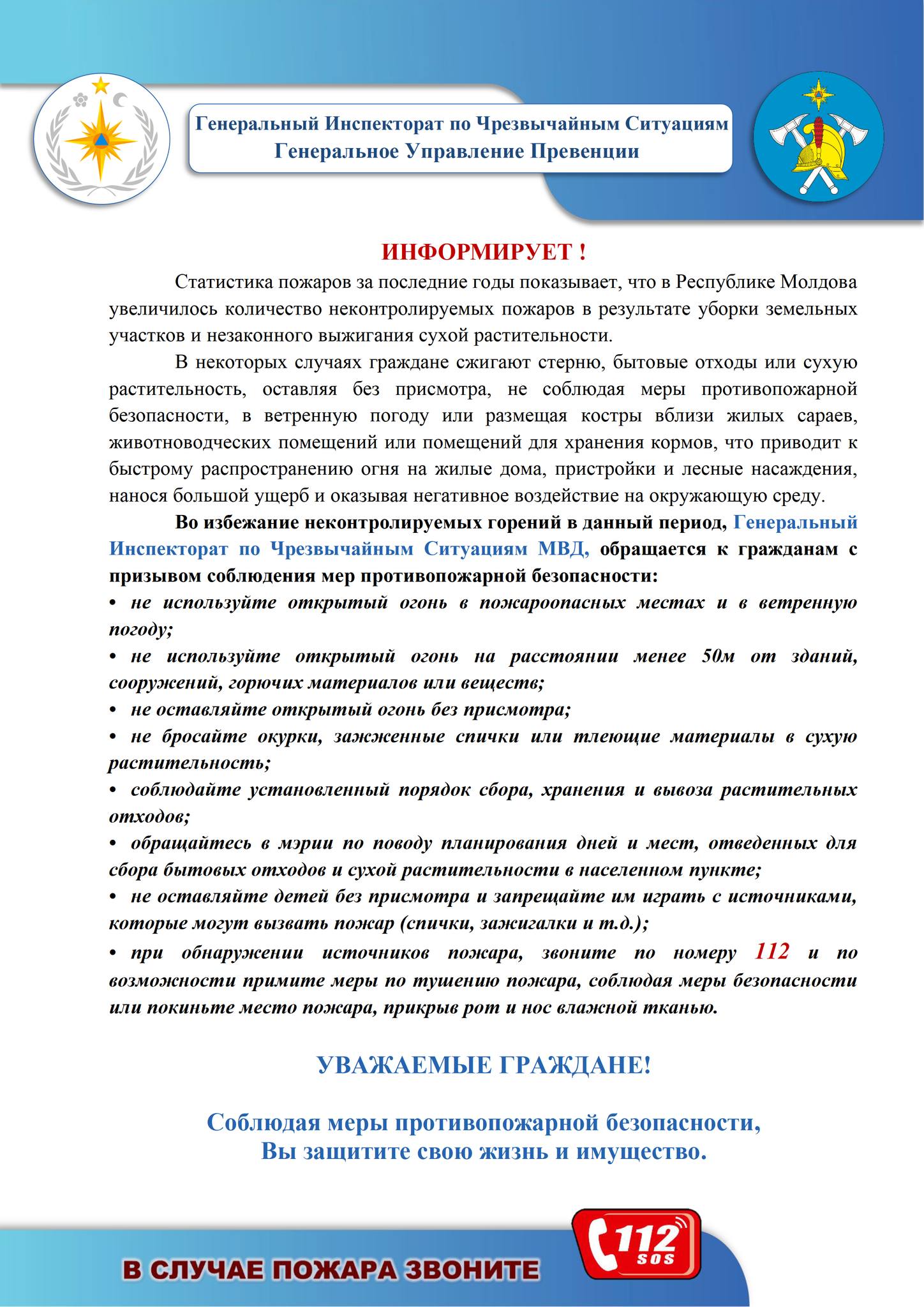 - -при обнаружении очагов возгорания звоните по номеру телефона 112 и, по возможности, примите меры по ликвидации возгорания, соблюдая меры безопасности.